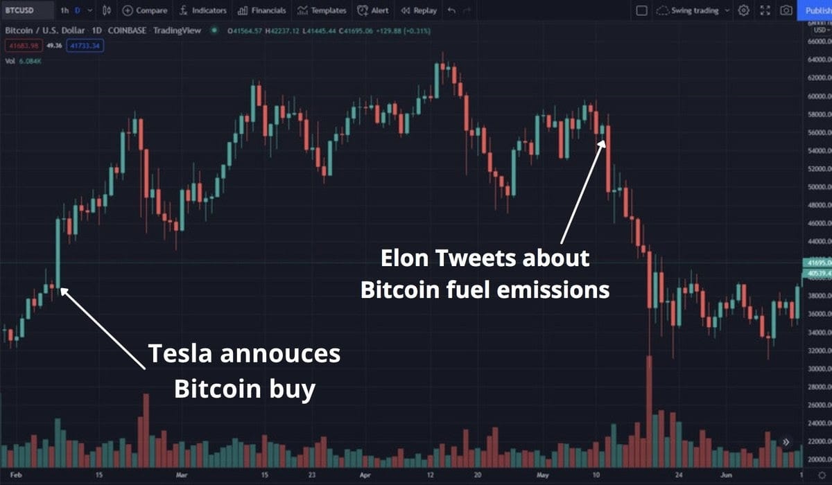 In addition to the Doge craze, It was announced that Elon added $1.5 billion worth of Bitcoin to Tesla’s balance sheet on February 8, while also accepting the crypto as payment. Tesla adding Bitcoin to its balance sheet helped boost Bitcoin’s price from around $35,000 to upwards of $63,000. Then shit hit the fan.