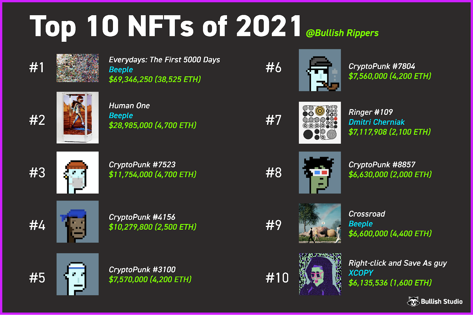 NFTs became a trending topic in 2021, with multiple works selling for over $1 million. Exclusive projects like CryptoPunks, originally minted in 2017, skyrocketed in value as the OGs of the space started to cash out. Digital artist Beeple also influenced the space with his animated paintings, one of which sold for $69 million and topped off the list of most expensive NFTs sold this year.