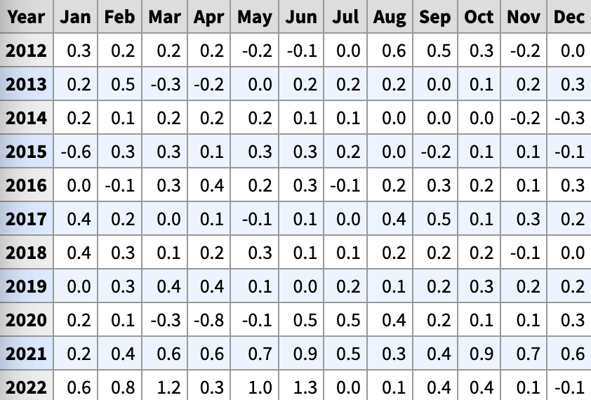 Month-over-Month Inflation Each Month Over the Last 12 Months: