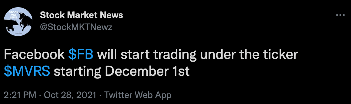 Facebook announced their name to change to Meta on Oct. 28. The original plan was to change the ticker to $MVRS on Dec. 1, I assume only because the $META ticker had been taken since June 30.