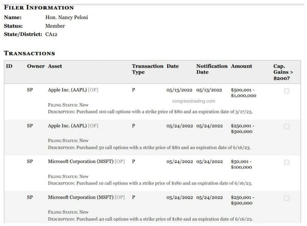 Nancy Pelosi filed for her purchase of calls in Microsoft and Apple, worth at least $1 million. - CongressTrading