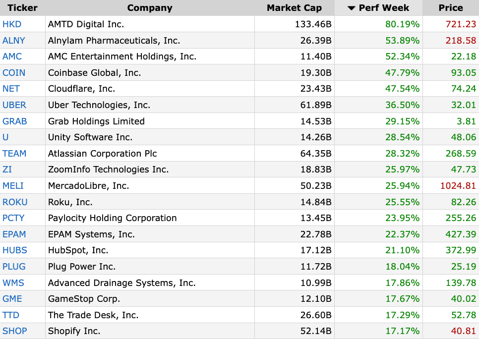 Note: The number one stock up there, $HKH, is a small Hong Kong company. Its stock is experiencing a very weird and interesting situation. Here's a good place to start looking (Axios). But don't buy into this stock, you will lose money!
