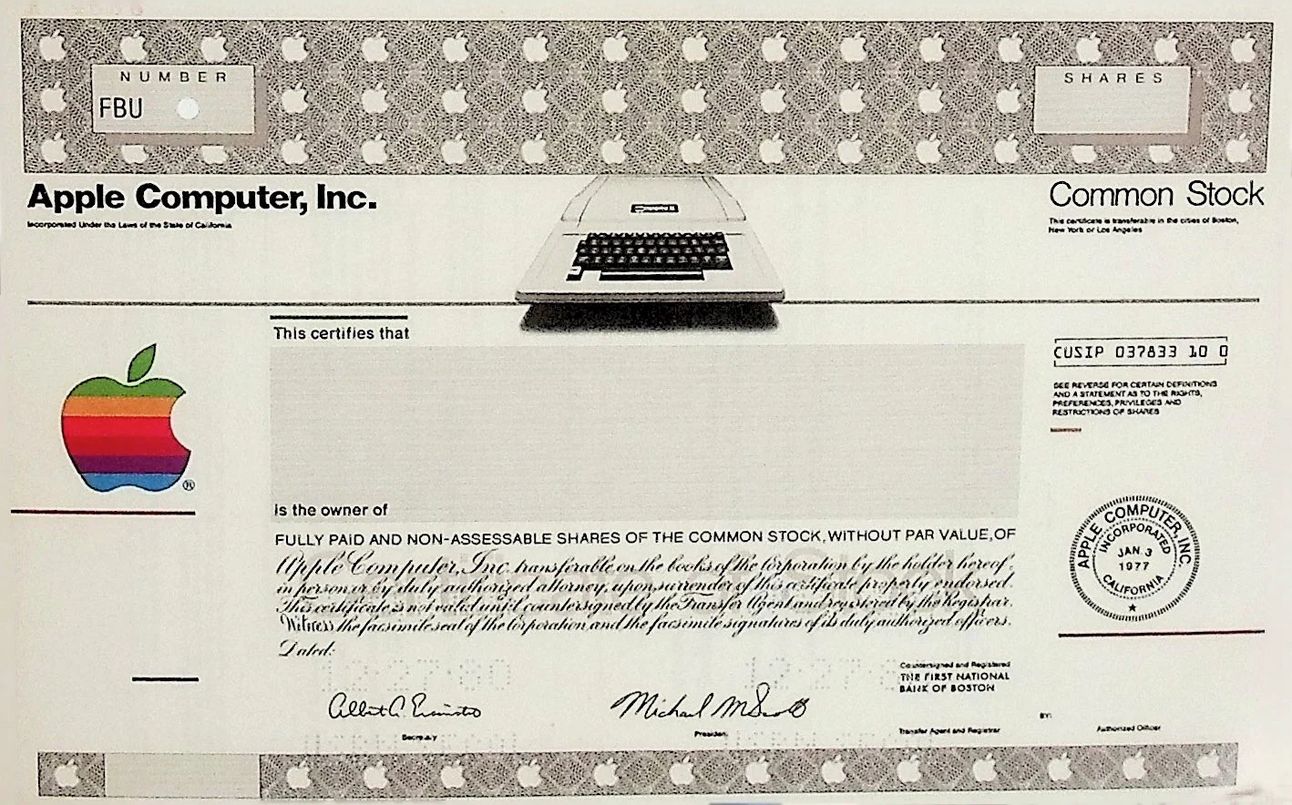 Check out this 1980s era Apple Computer Stock Certificate replica postcard in the Ticker History Shop.