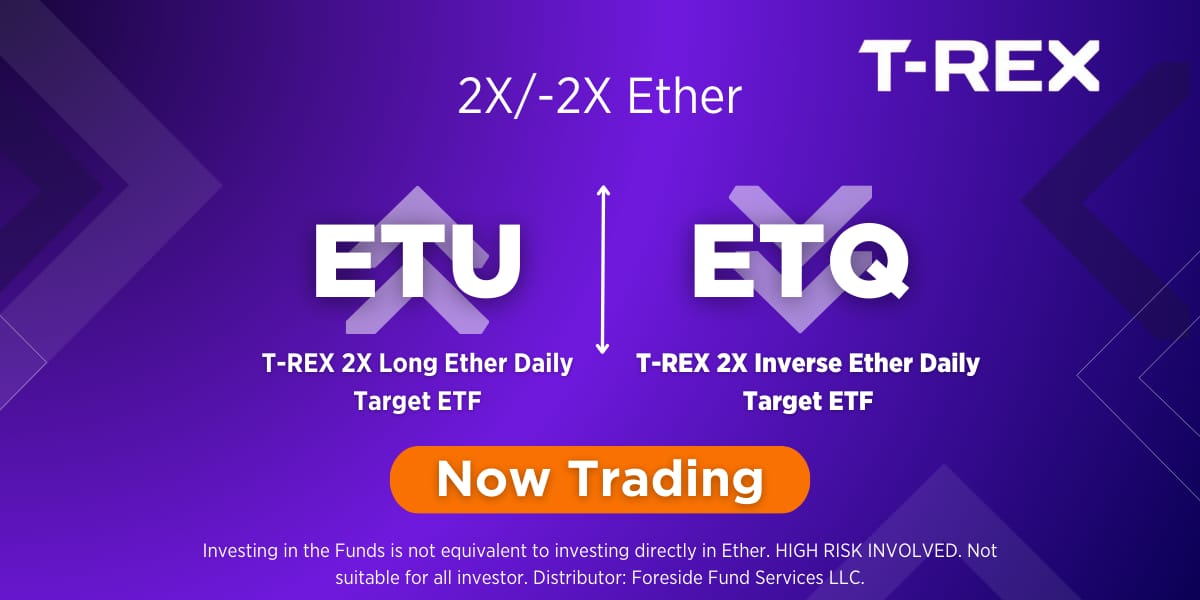 Whether you're bullish or bearish on Ether, T-REX ETFs provide a gateway to dynamic market strategies. Gain exclusive access to leveraged exposure with 2X Ether (ETU) and -2X Ether (ETQ) ETFs, designed specifically for trading Ether.