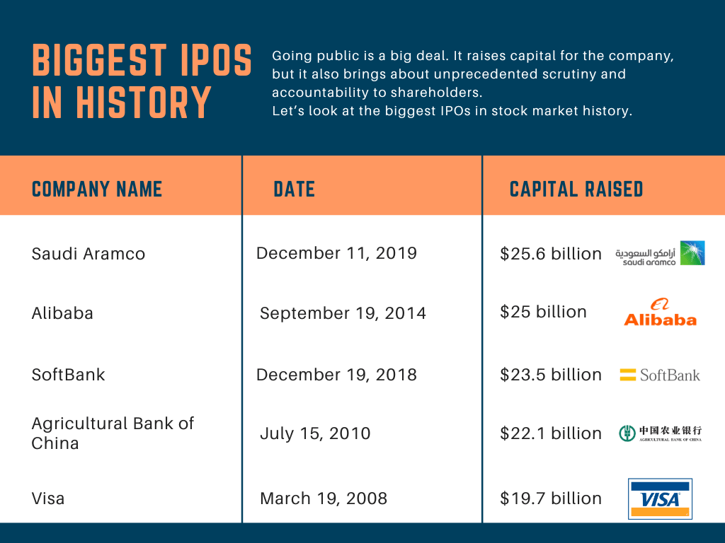 The Saudi Aramco IPO is the largest stock debut in history, raising $25.6 billion on Tadawal, the Saudi Stock Exchange. Saudi Aramco, the national oil company of Saudi Arabia, offered 1.5% of its shares to the public at 32 riyals ($8.53) each, valuing the company at approximately $1.7 trillion. The IPO was a key component of Saudi Arabia's Vision 2030, a plan aimed at diversifying the kingdom’s economy beyond oil dependency.